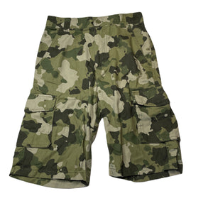 L&D khaki camo print cotton cargo shorts, W: 32.5cm across, size 10, Pre-loved