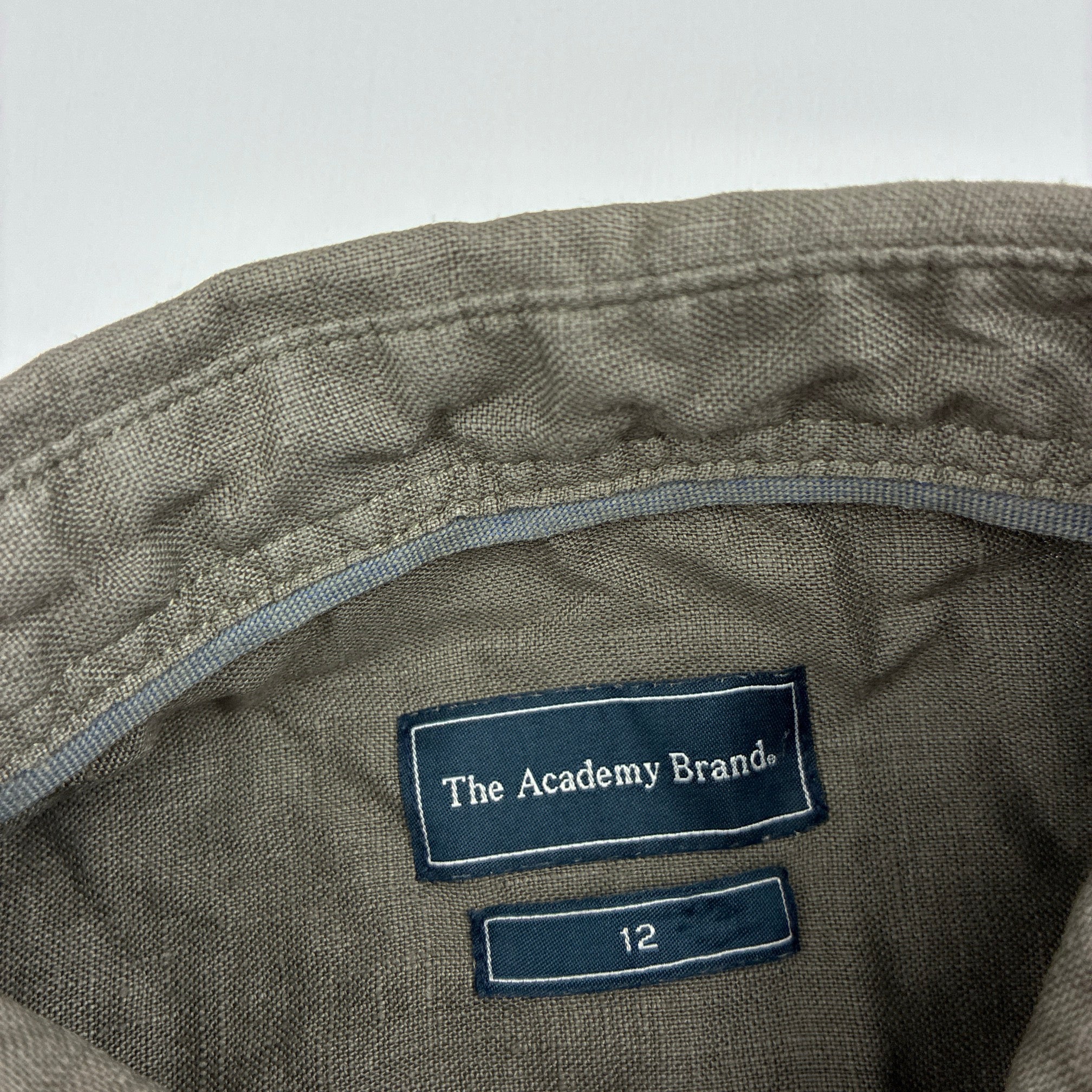 The Academy Brand, khaki linen long sleeve shirt, small light marks, FUC, size 12,