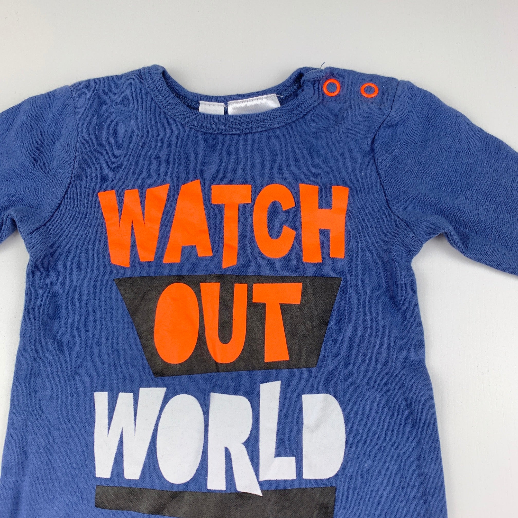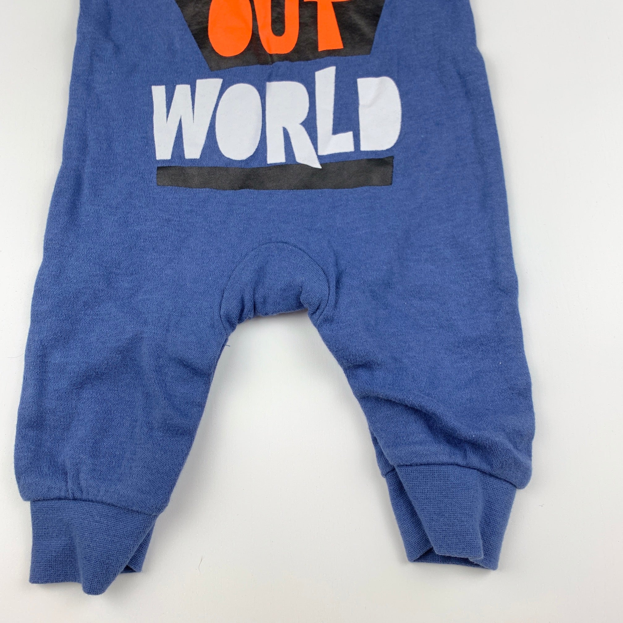 Dymples, blue cotton romper, watch out world, EUC, size 0000,