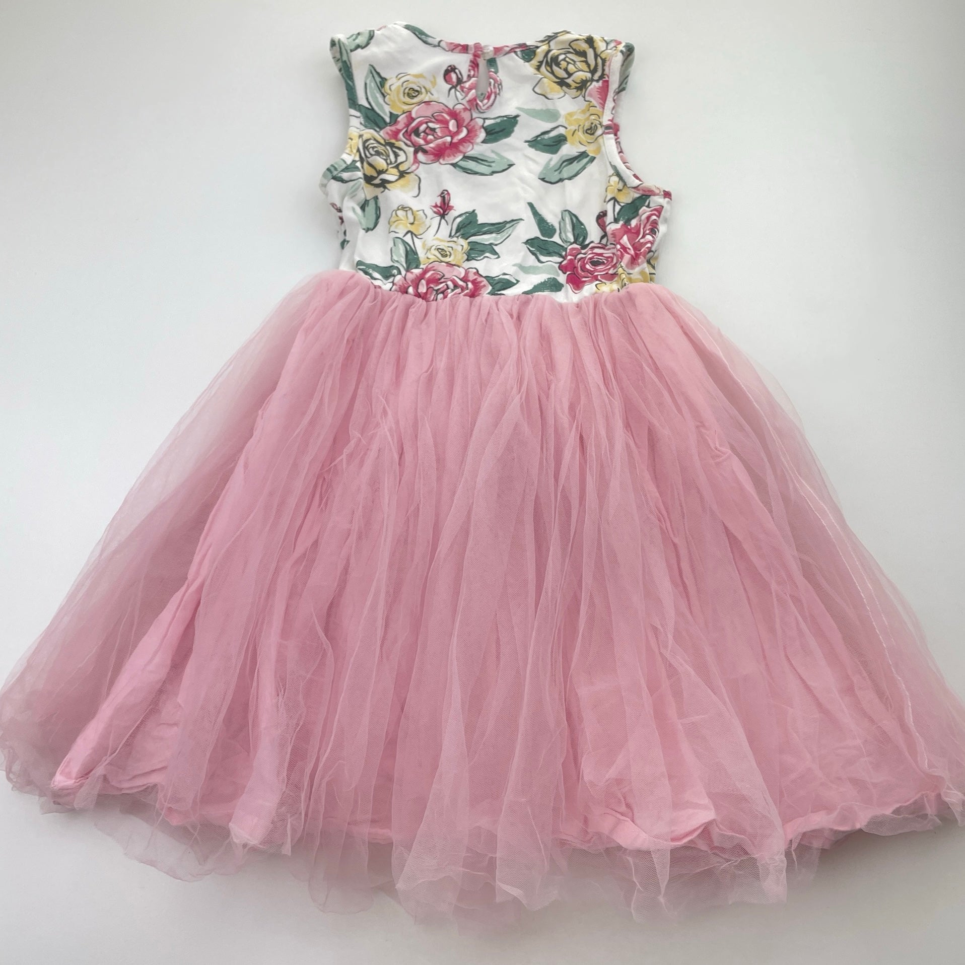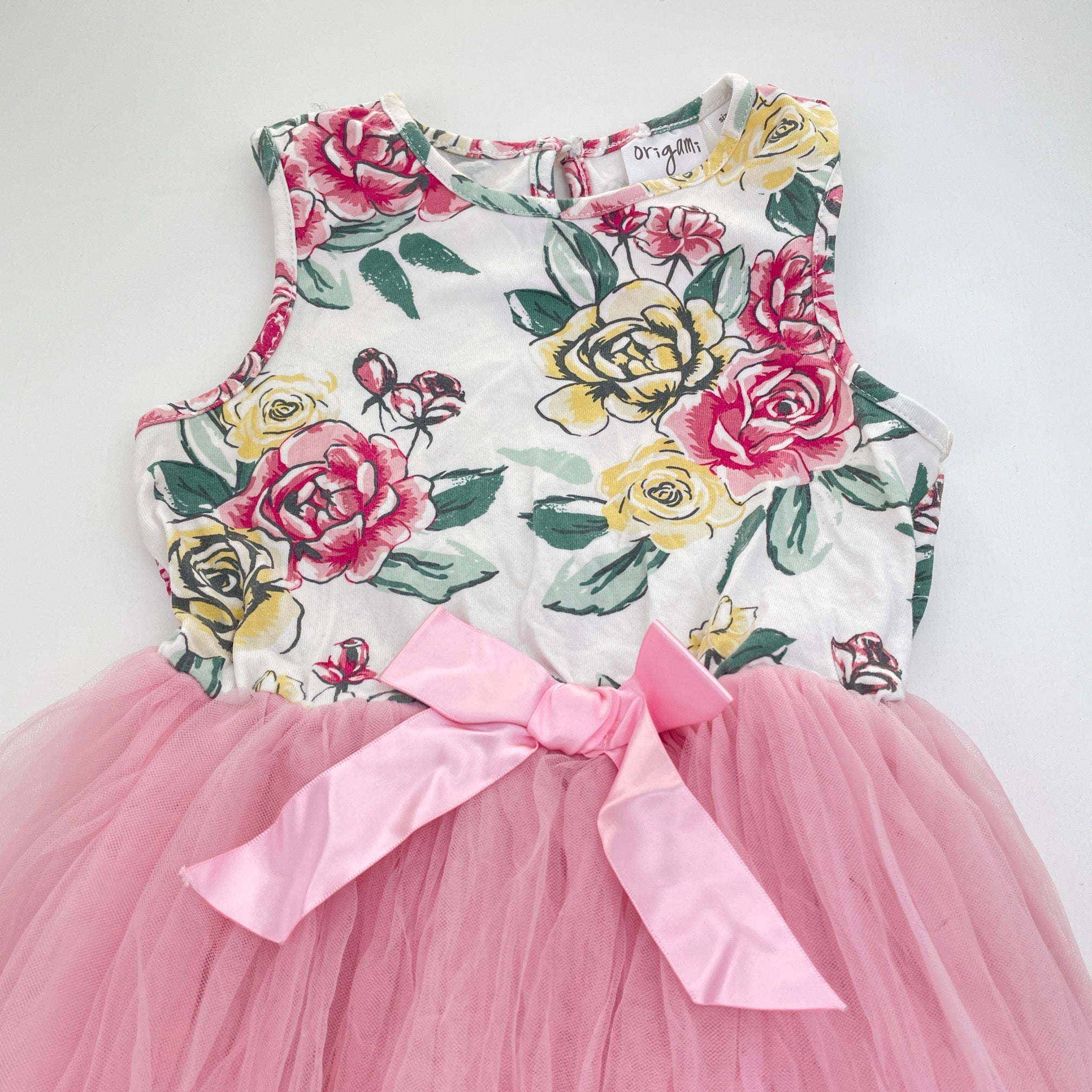 Girls Origami, cotton lined tulle & floral party dress, GUC, size 5, L: 58cm