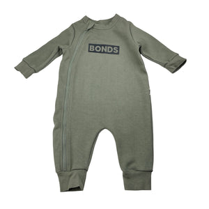 Bonds khaki Techsweat zip romper, size 00, Pre-loved