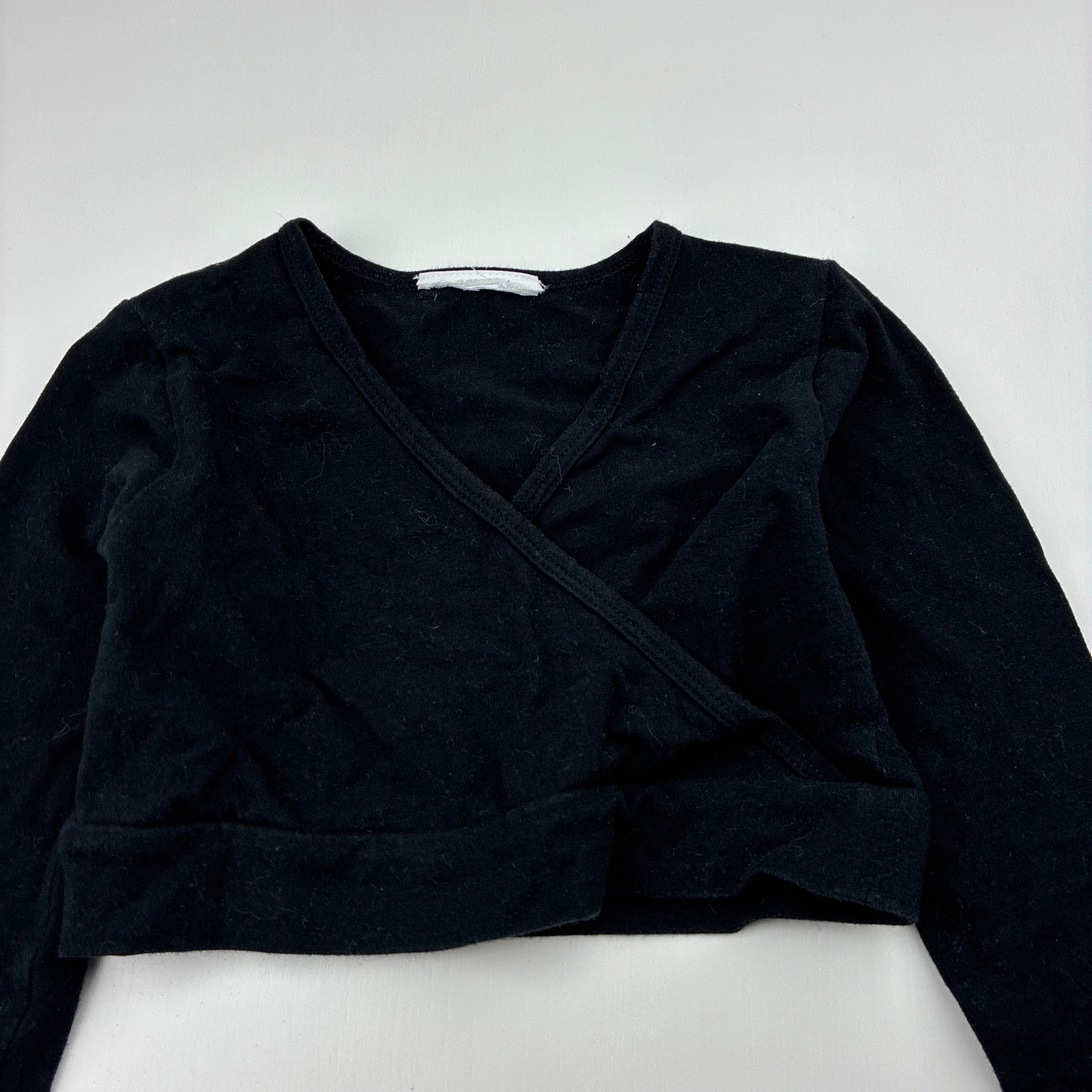 black, stretchy ballet / dance cross-over top, no labels, armpit to armpit: 25cm, shoulder to cuff: 33cm, GUC, size 2-3,
