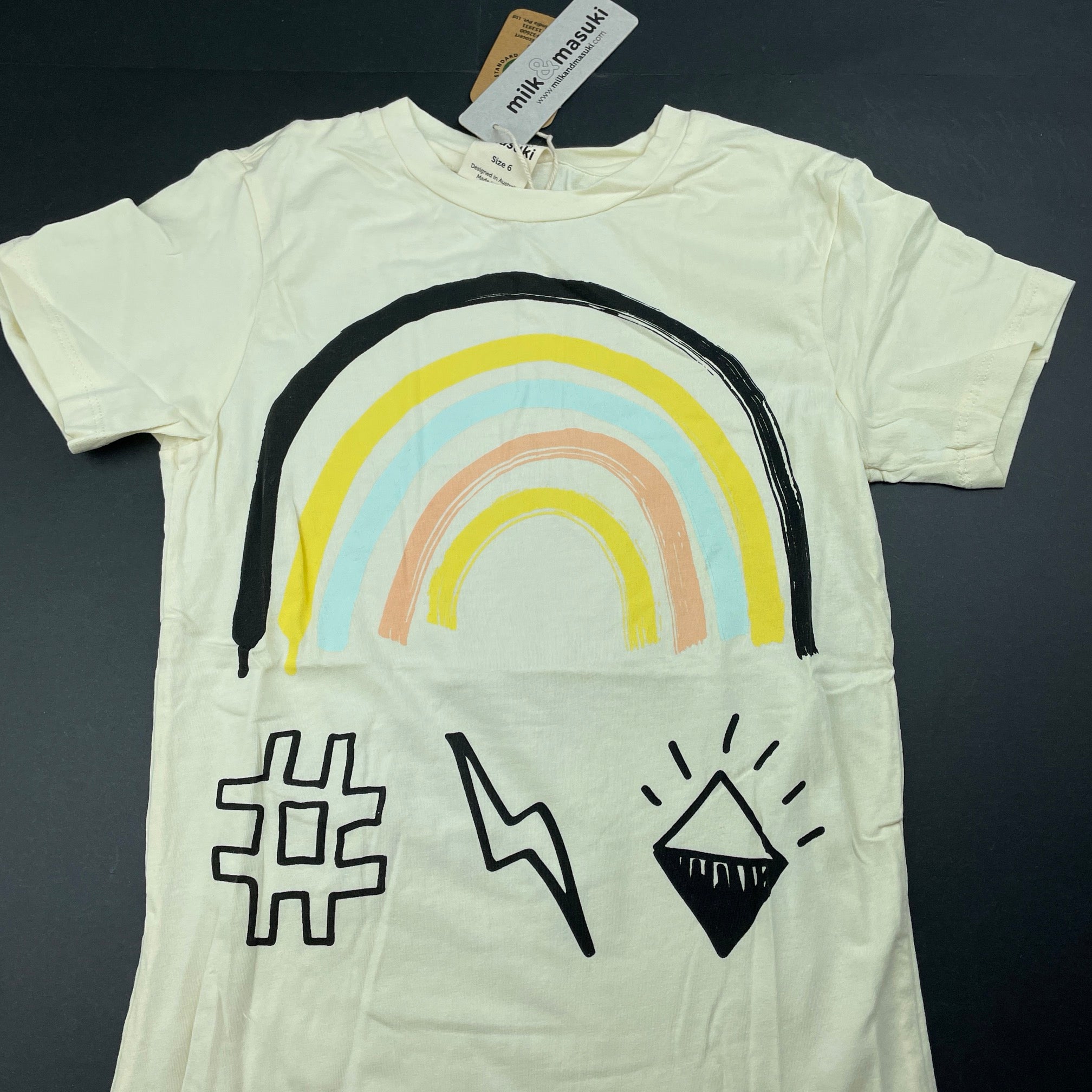 Milk & Masuki, stretchy organic cotton blend t-shirt, rainbow, NEW, size 6,