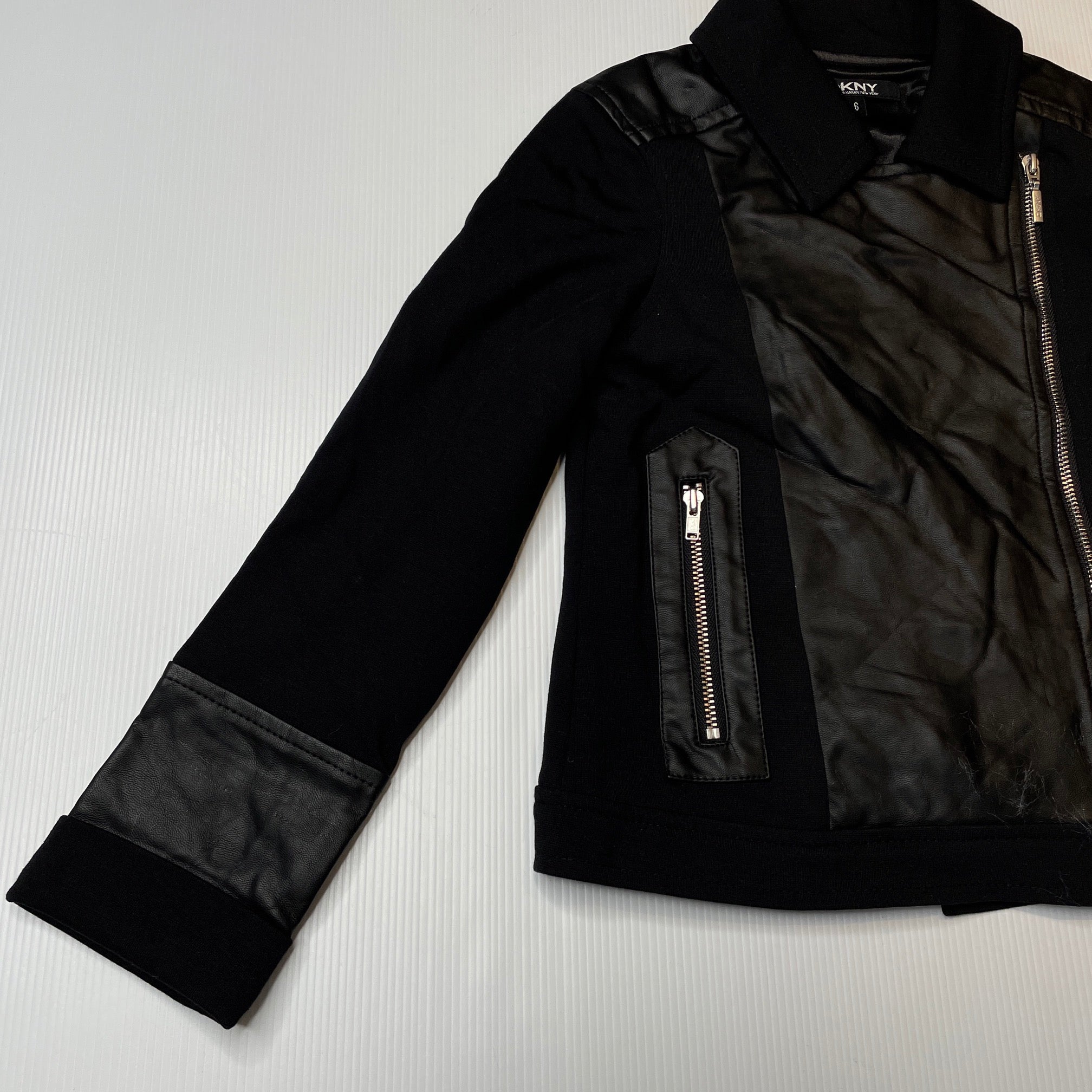 DKNY, black lightweight jacket, faux leather detail, EUC, size 6,