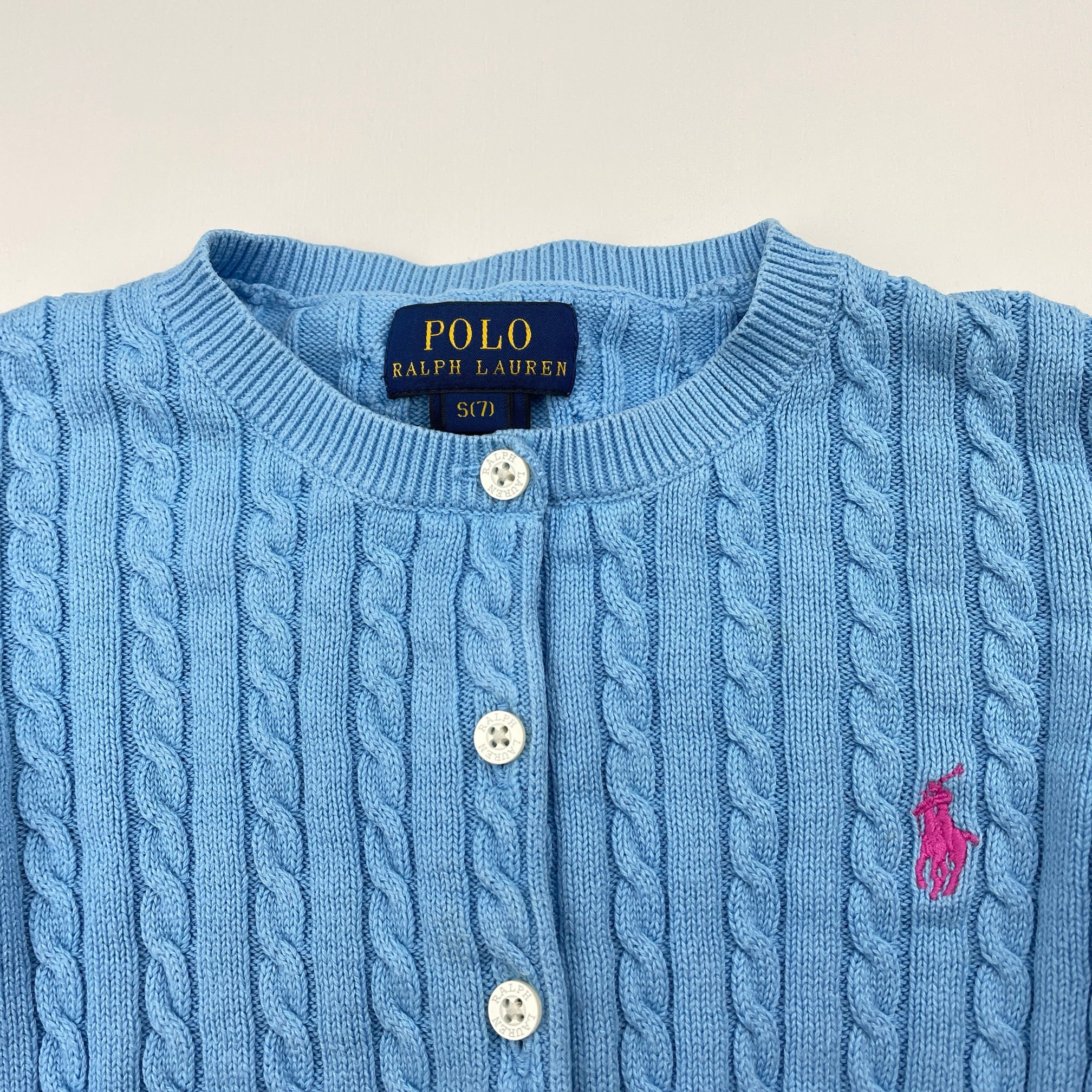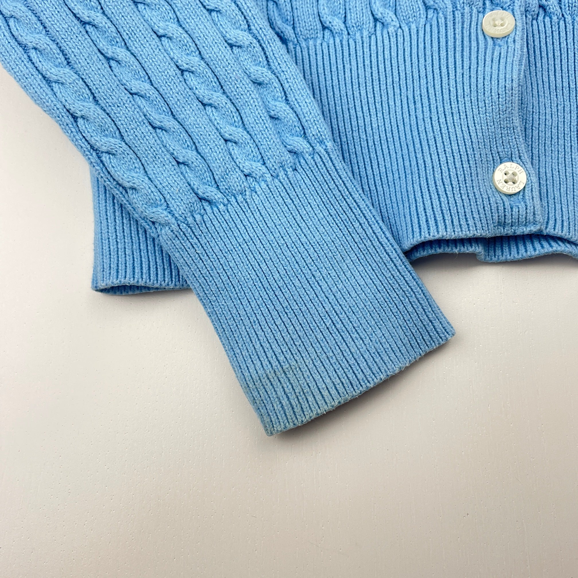 POLO RALPH LAUREN, blue cotton cable knit cardigan (marks on cuffs), FUC, size 7,