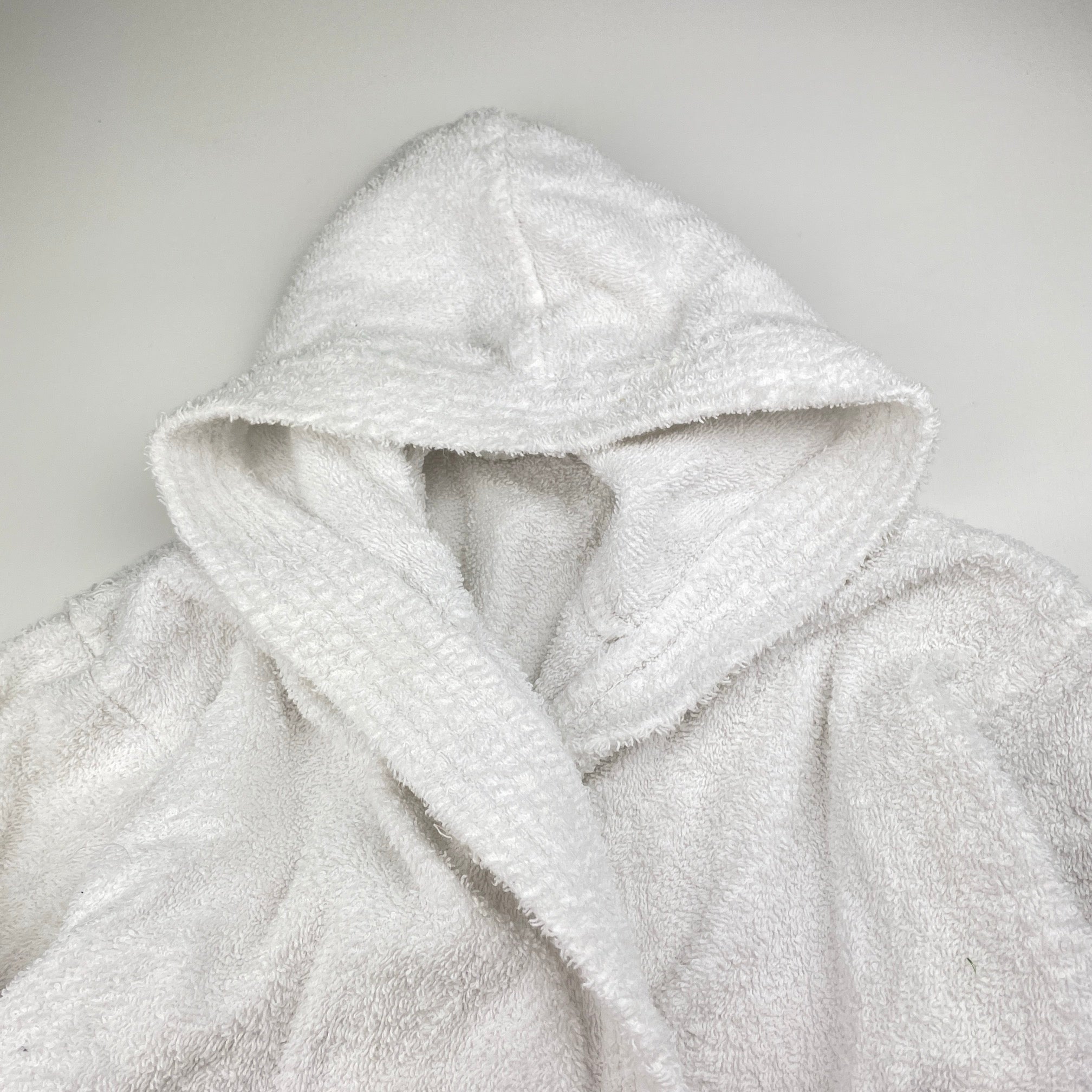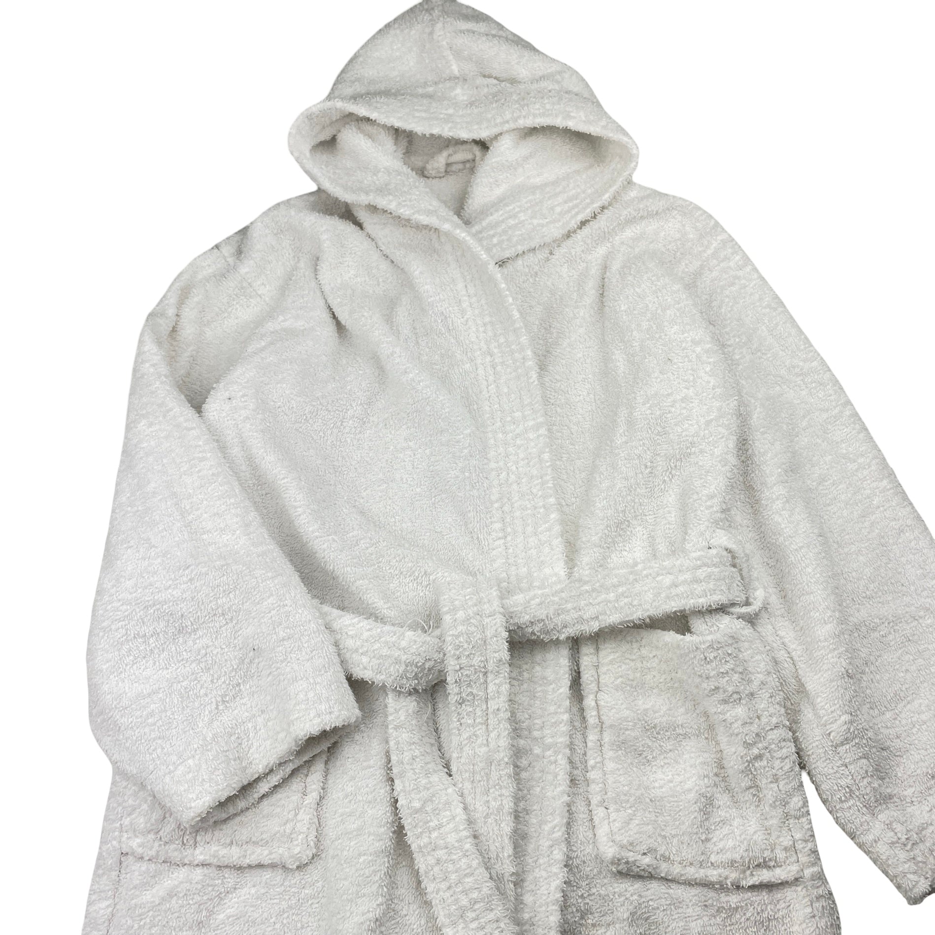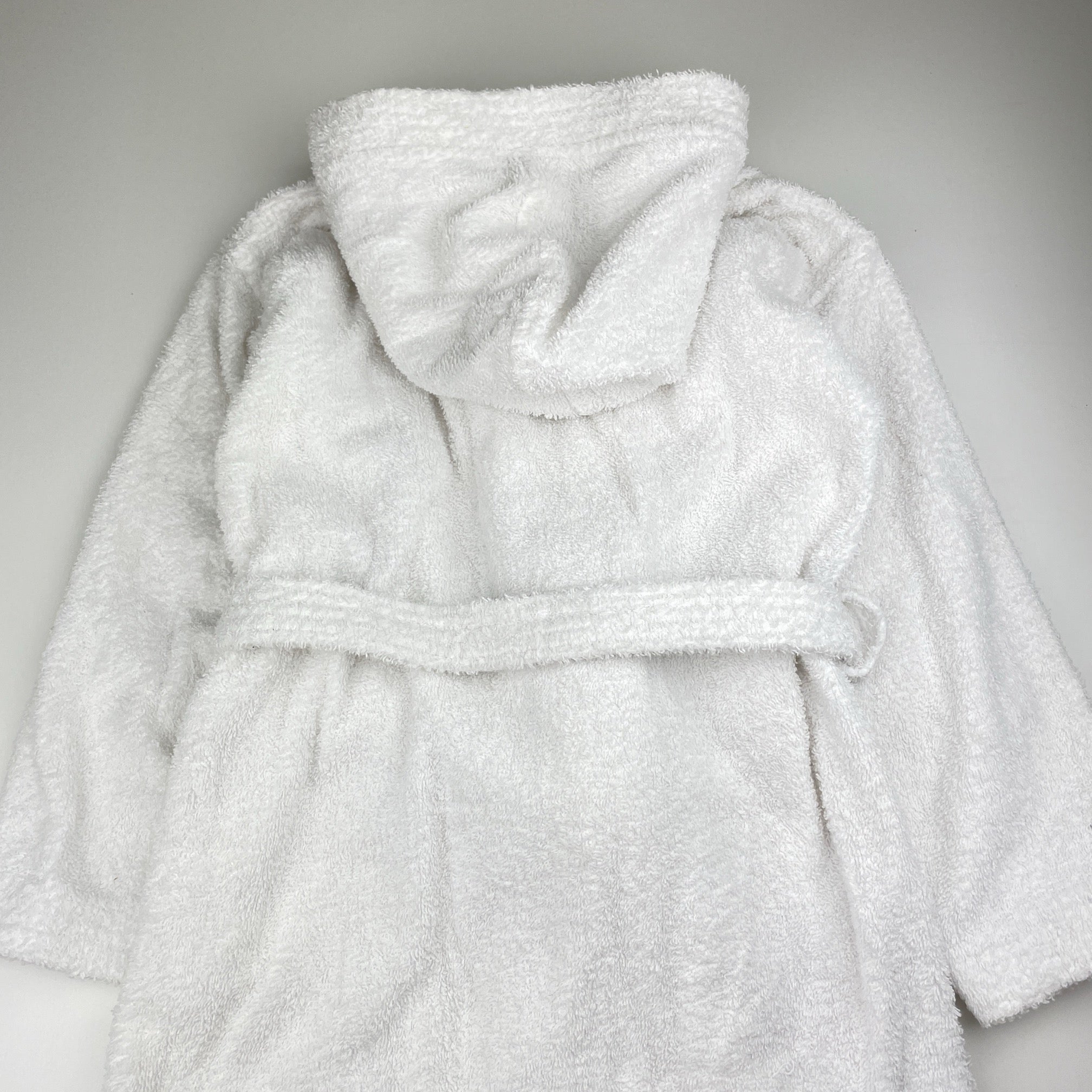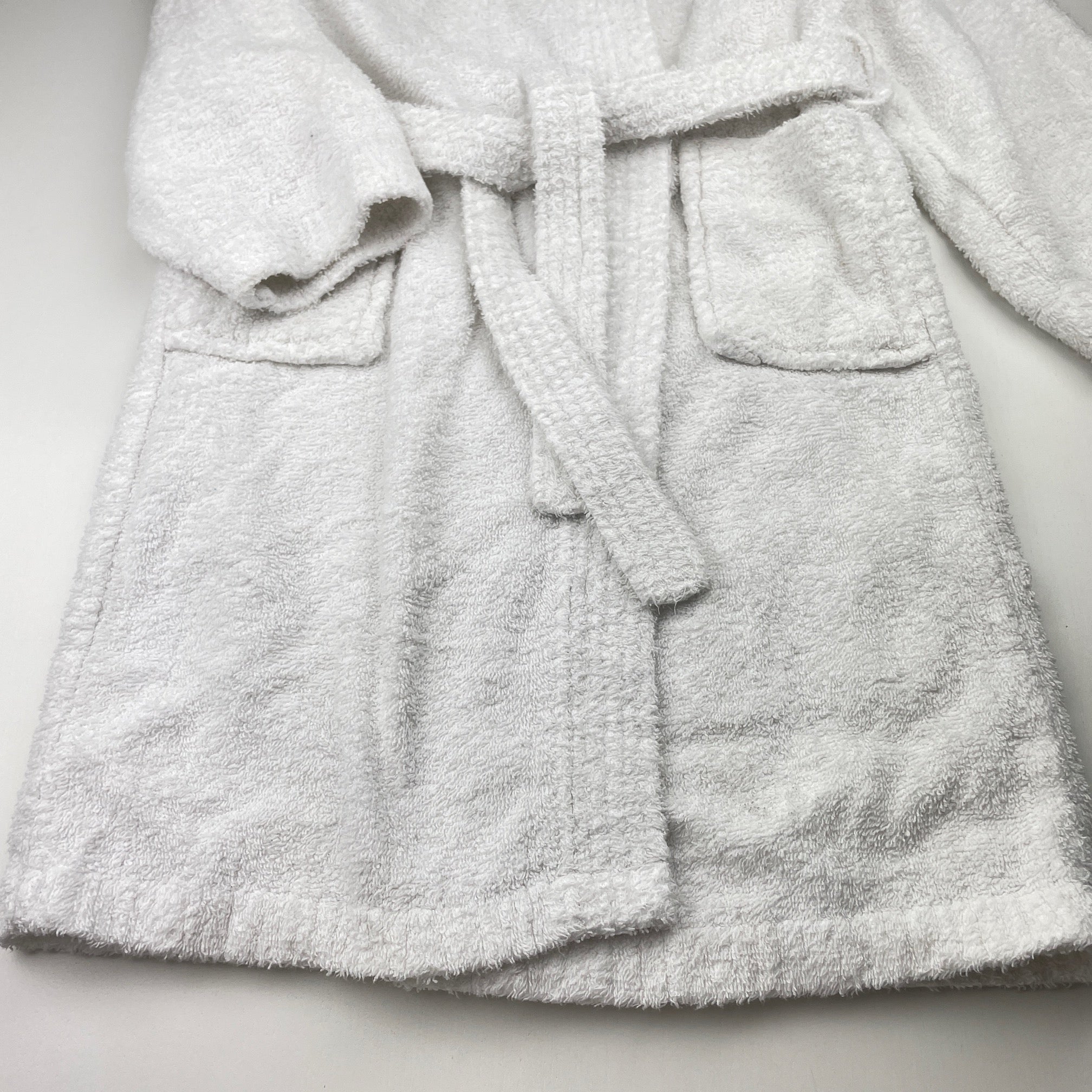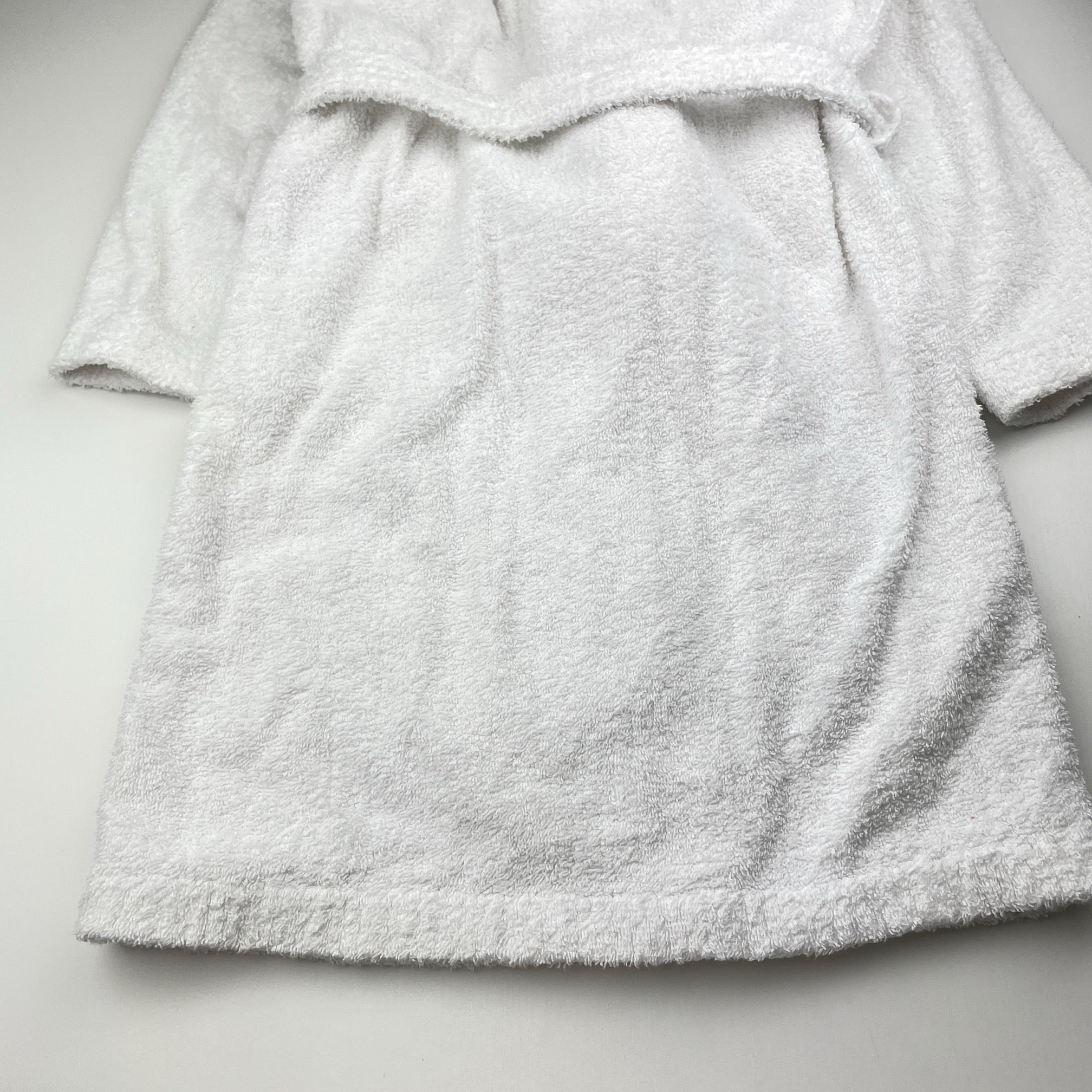 white towelling dressing gown / bath robe (no labels), shoulder to cuff: 42cm, size 7-8, Pre-loved