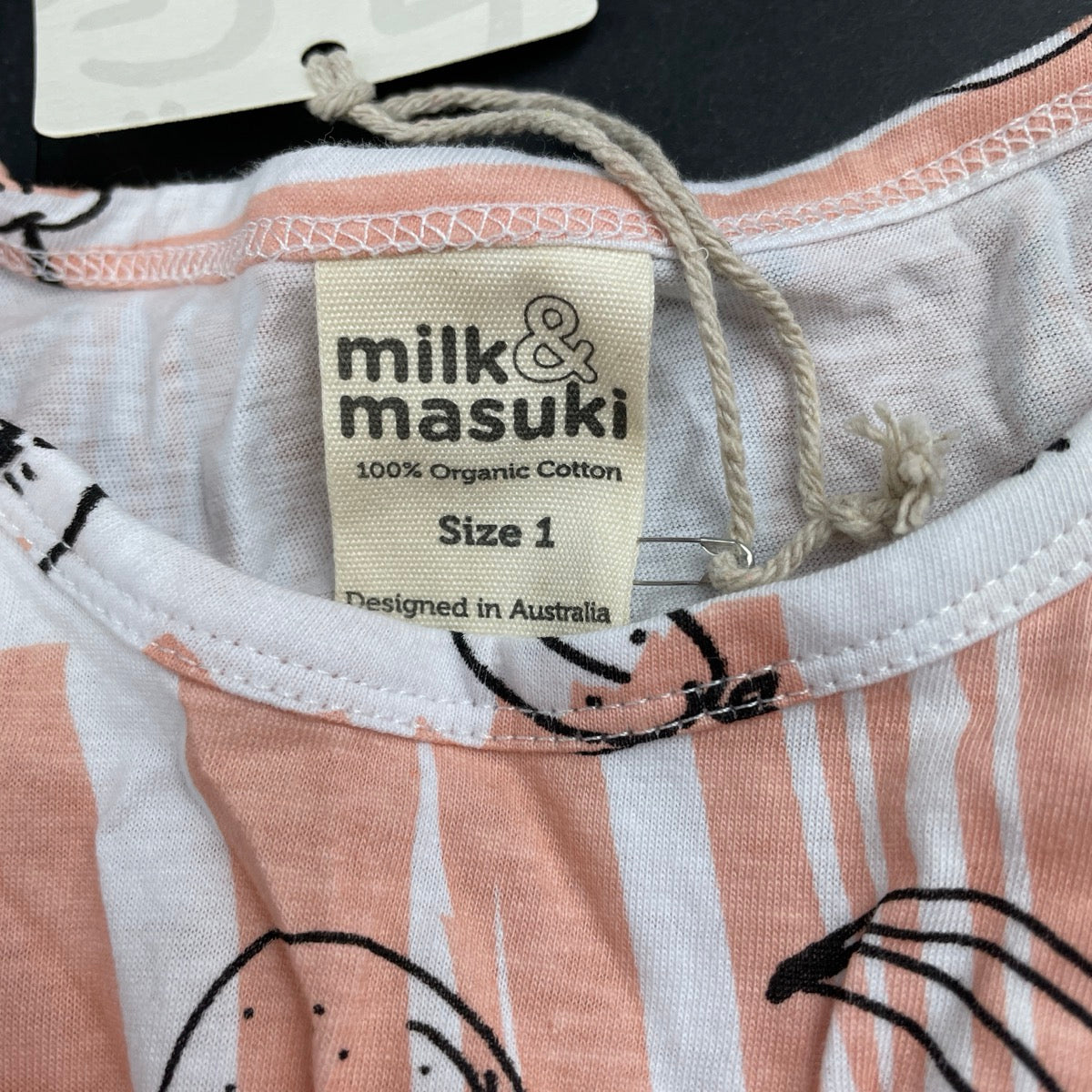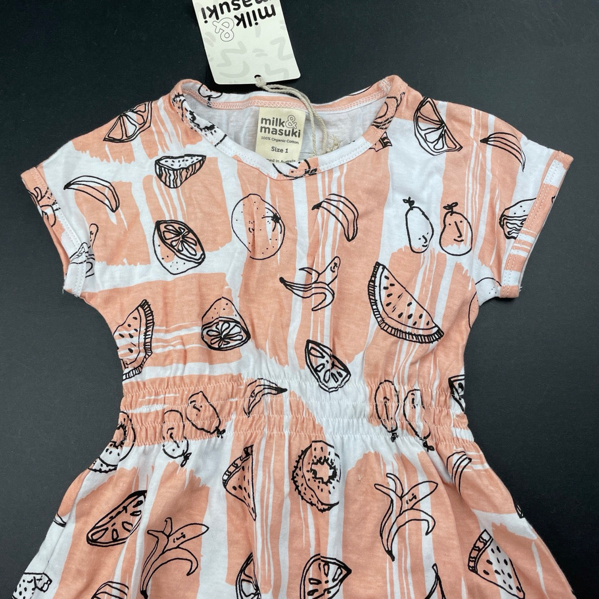 Milk & Masuki, organic cotton elastic waist dress, fruit, NEW, size 1, L: 44cm