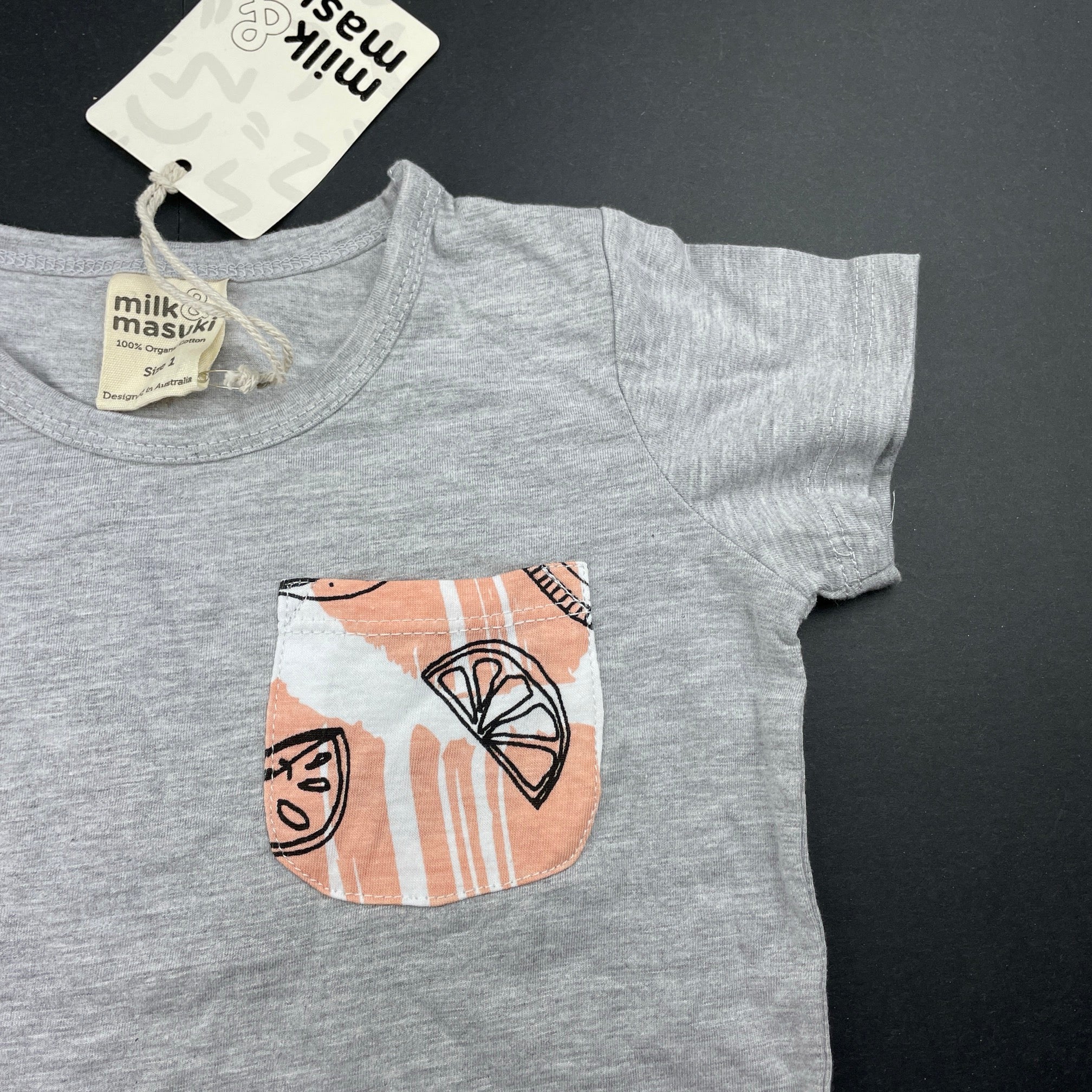 Milk & Masuki organic cotton t-shirt / top, fruit pocket (print placement may vary), size 1, BNWT