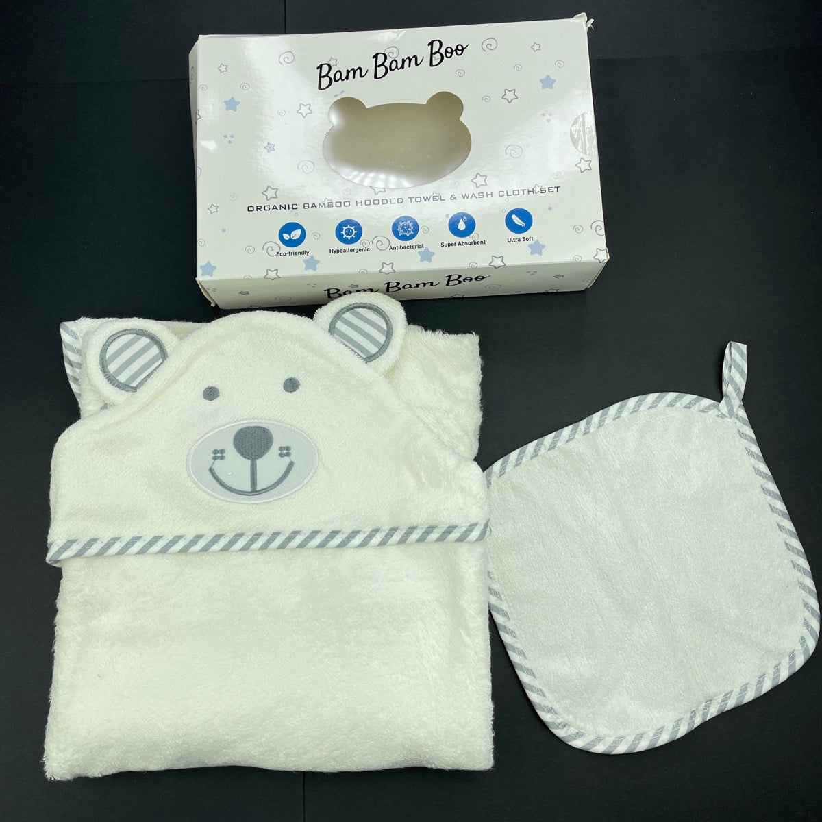 Bam Bam Boo organic bamboo hooded towel & wash cloth set, 89cm x 89cm, box damaged, size 000-1, BNWT