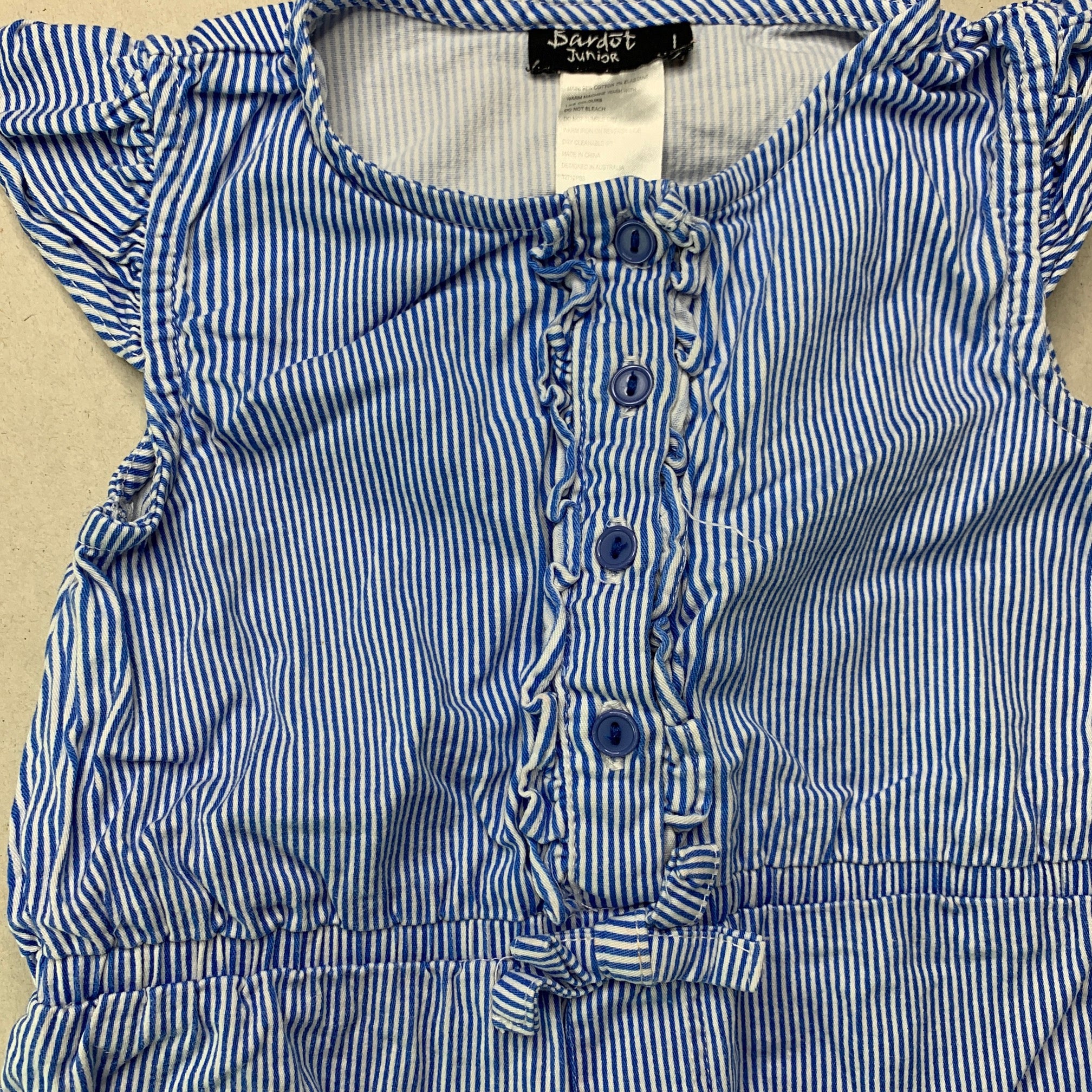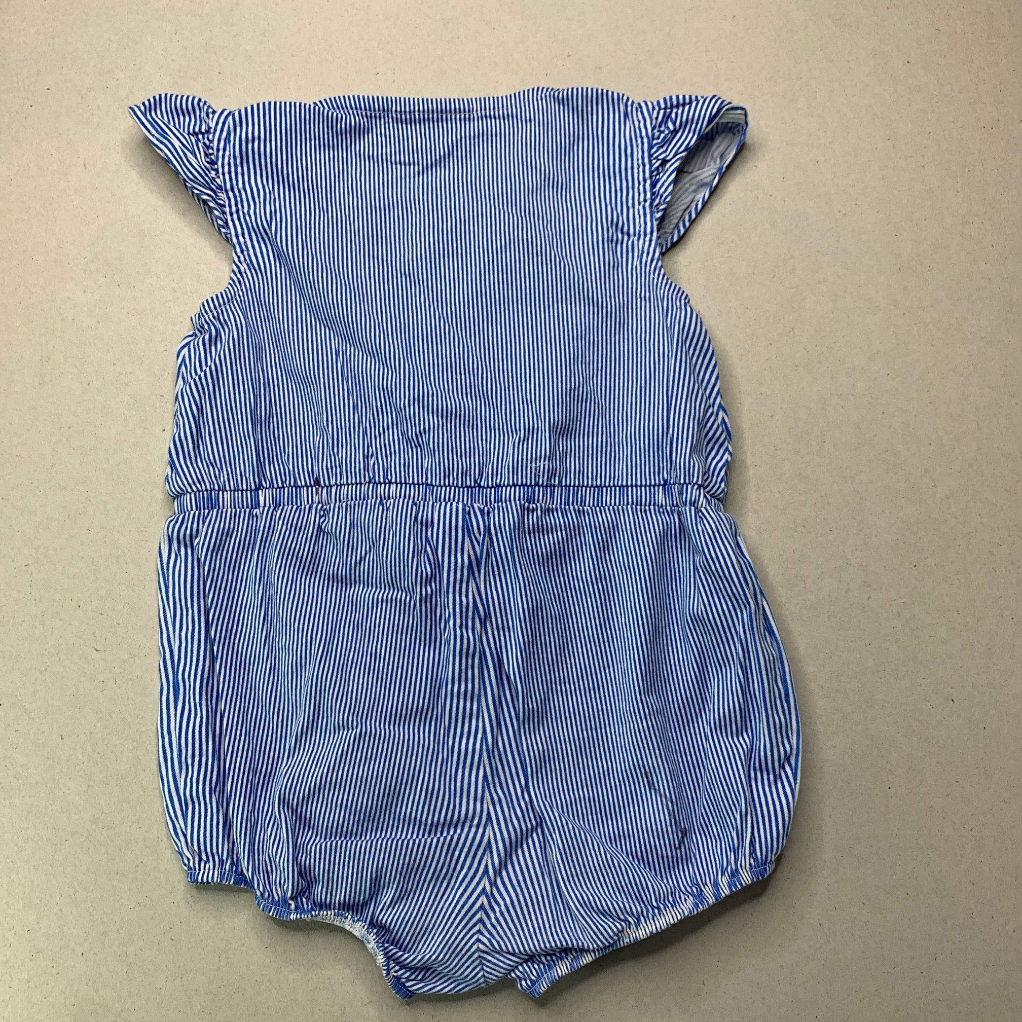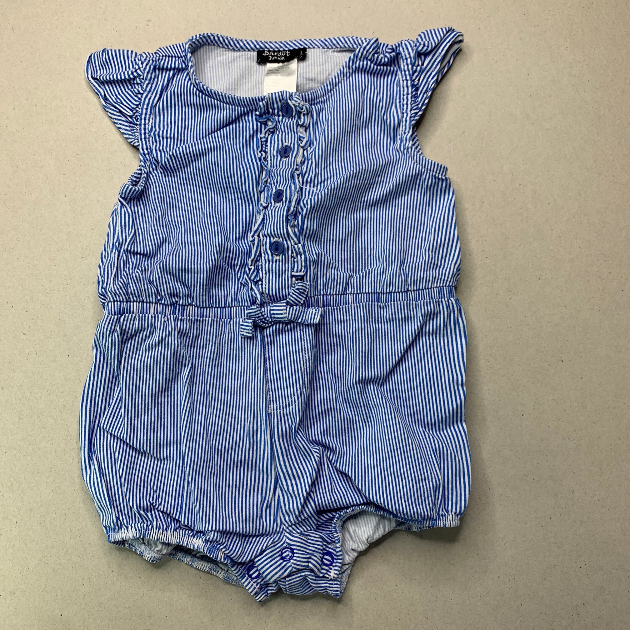 Bardot Junior, blue stripe stretch cotton romper, marks lower back, FUC, size 1,