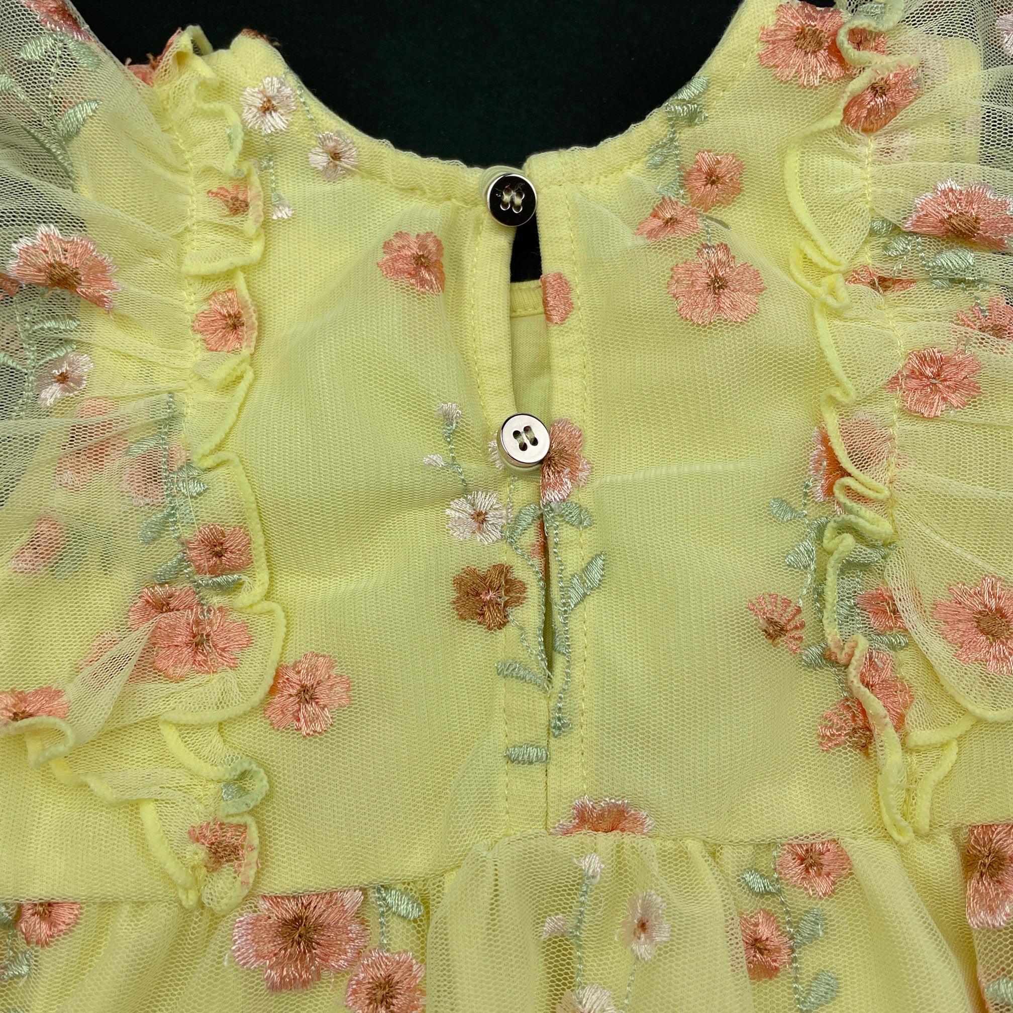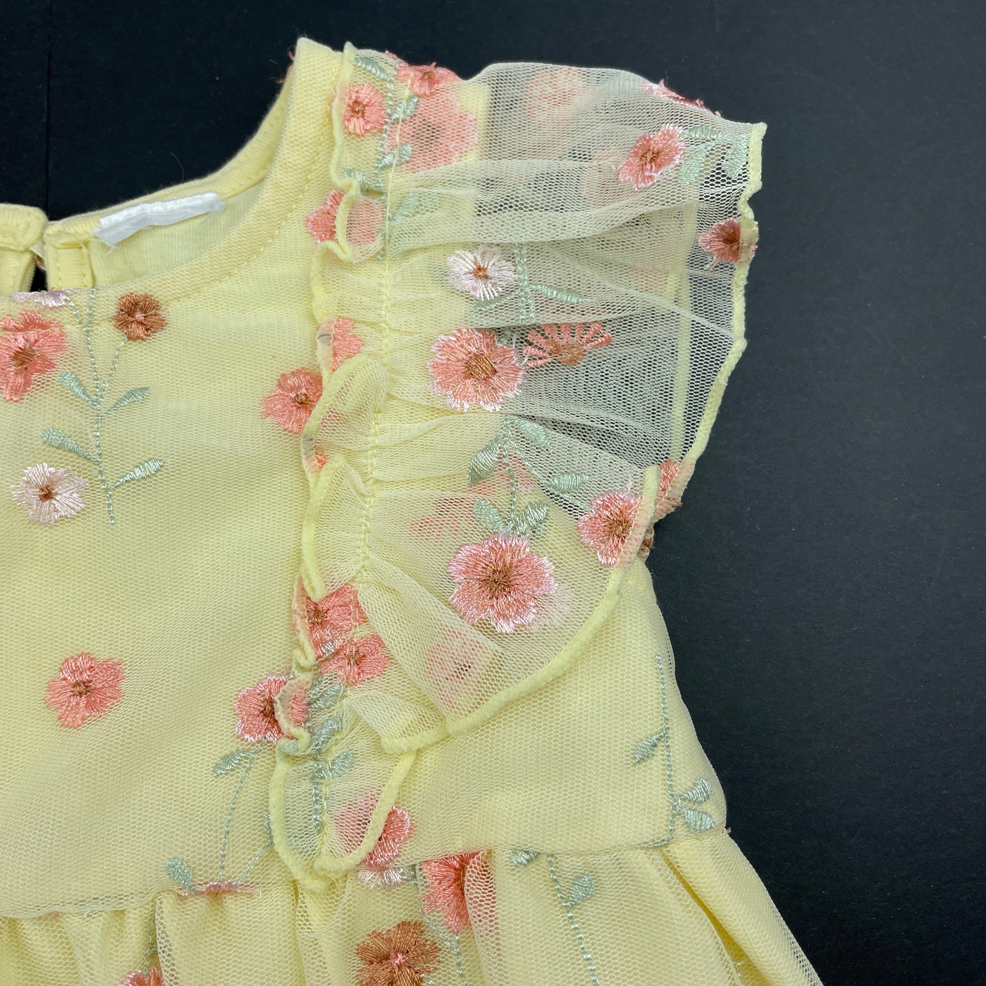 embroidered, yellow romper, labels removed, EUC, size 0,