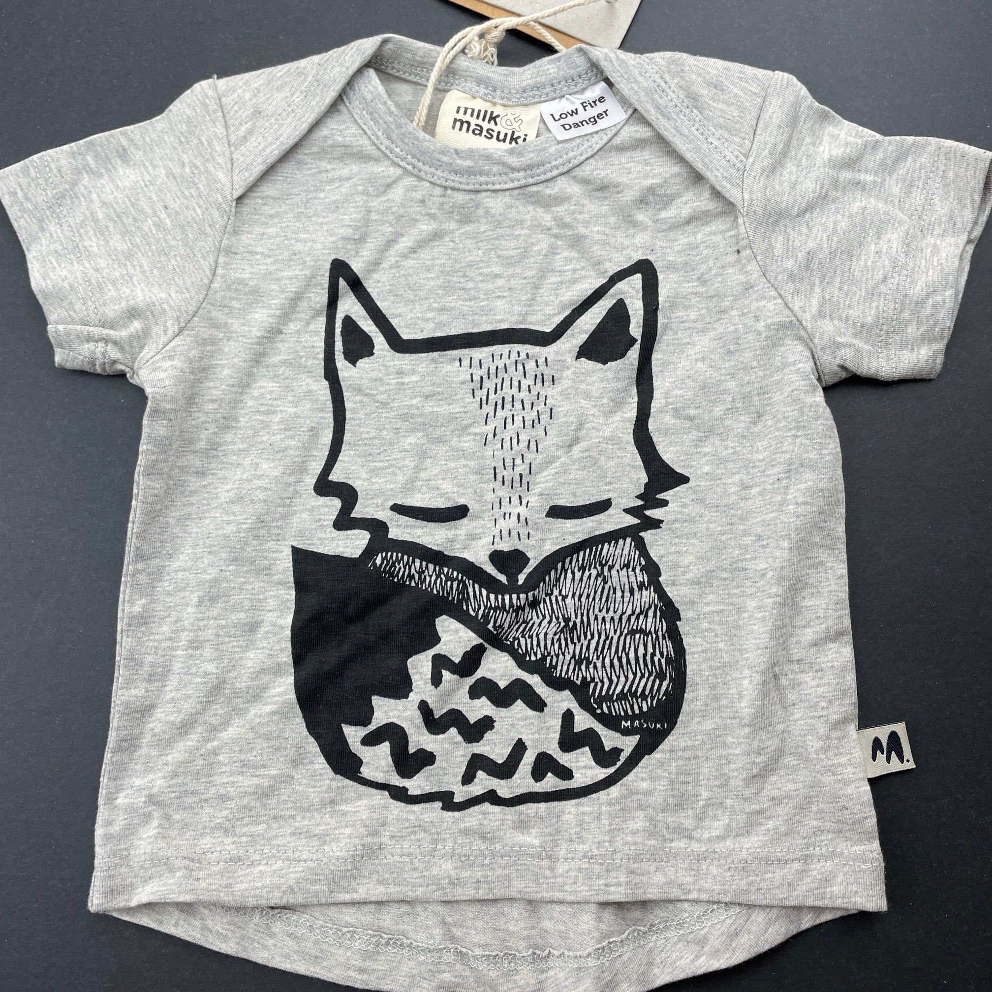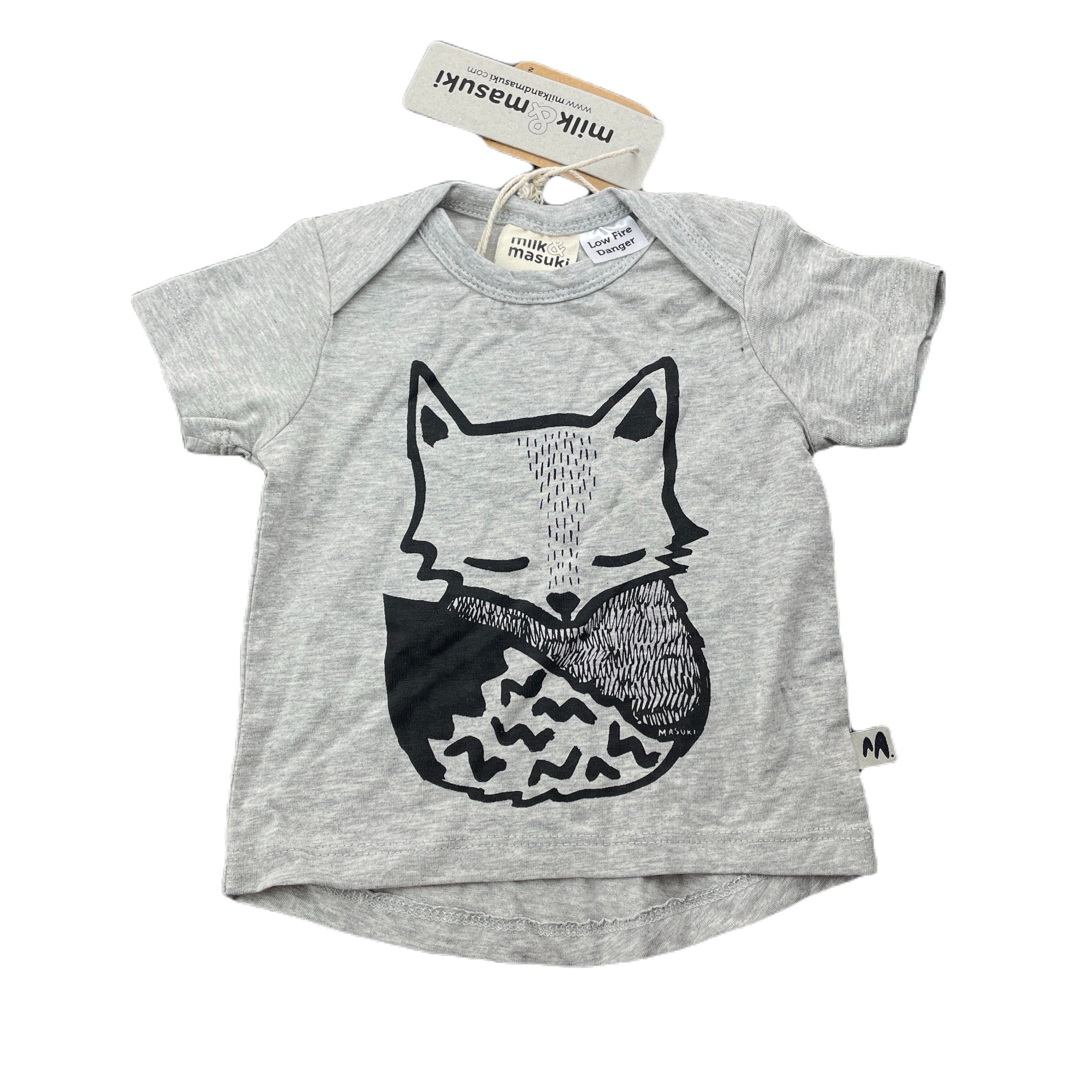 Milk & Masuki, stretchy organic cotton t-shirt/top, sleeping fox, NEW, size 00,