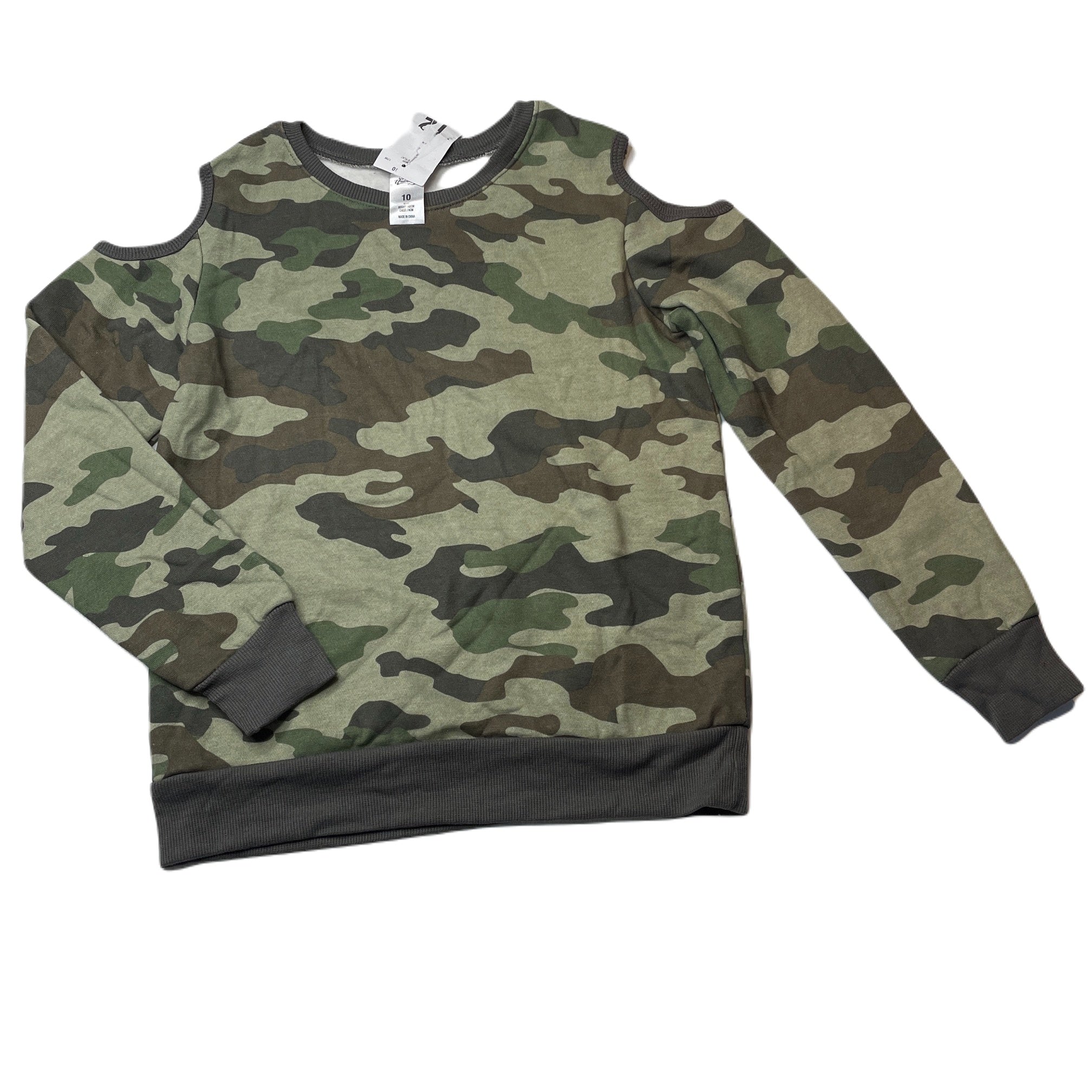 Miss Understood, fleece lined open-shoulder camo print sweater, NEW, size 10,